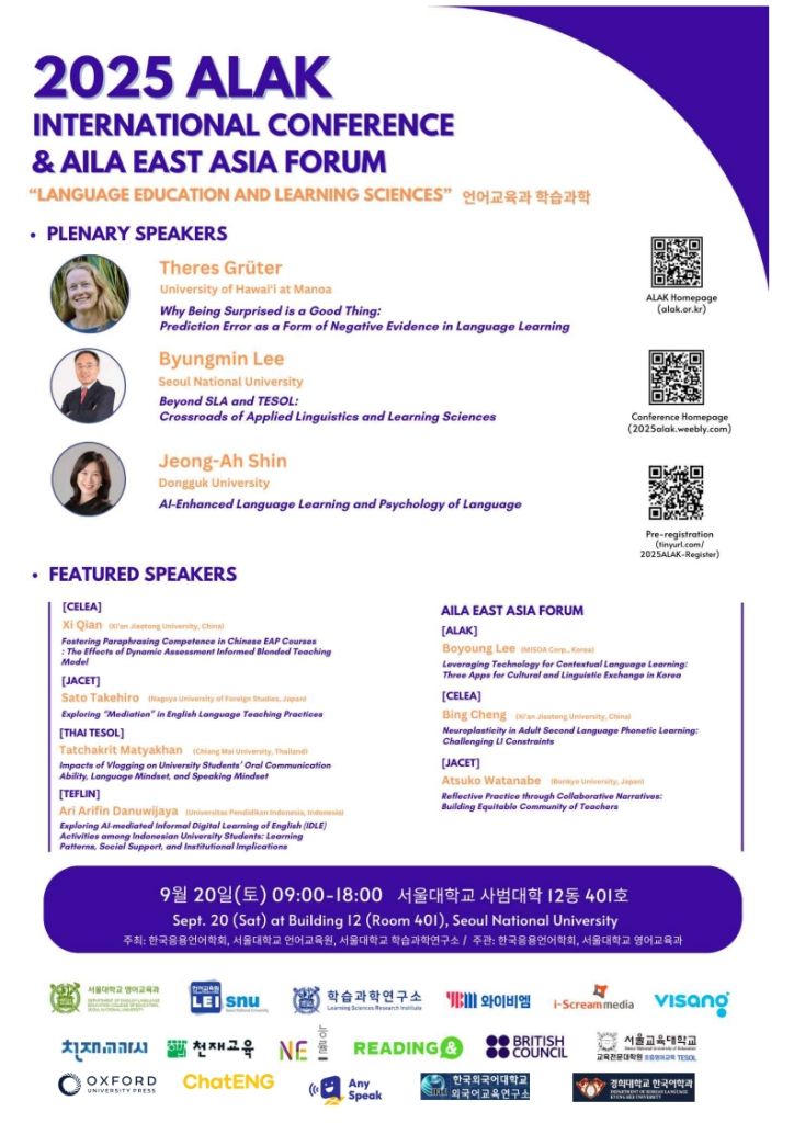한국응용언어학회 국제학술대회(9.20 서울대) 프로그램 & 사전등록안내(9.16 마감)–2025 ALAK & AILA East Asia