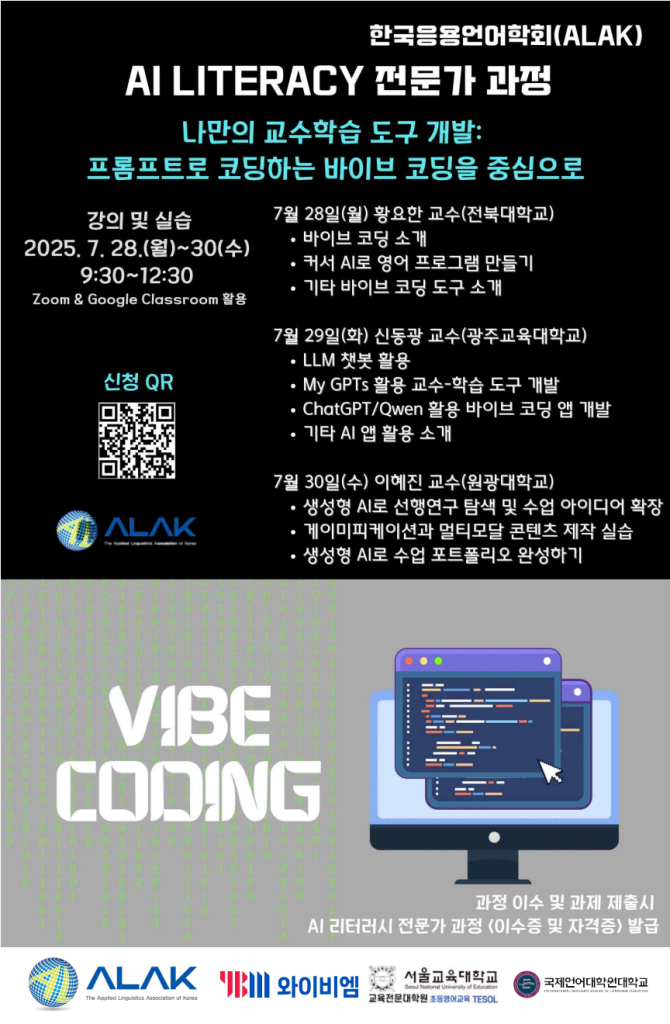 한국응용언어학회(ALAK)는 회원 여러분의 AI 활용 역량 강화를 위해 “AI 리터러시 전문가 과정”을 마련하였습니다. “프롬프트로 코딩하는 바이브 코딩을 통한 나만의 교수학습 도구 개발”을 주제로, AI 시대에 필요한 교육 도구를 직접 설계하고 활용하는 능력 향상을 목표로 합니다. Zoom과 Google Classroom을 활용한 온라인 강의로 진행되며, 언어교육 현장에서의 AI 활용 가능성을 넓히는 좋은 기회가 될 것입니다. 회원 여러분의 많은 관심과 참여를 부탁드립니다.