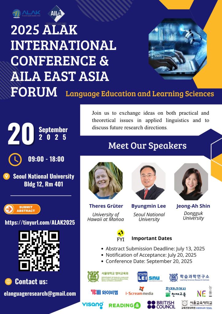 The Applied Linguistics Association of Korea (ALAK) cordially invites you to submit an abstract for the 2025 ALAK International Conference and AILA (International Association of Applied Linguistics) East Asia Forum, to be held at Seoul National University on September 20, 2025. The theme of the conference is “Language Education and Learning Sciences.” The conference will cover a wide range of topics related to applied linguistics, with particular emphasis on studies in language education and learning sciences. We aim primarily to bring researchers from around the world closer together to exchange ideas on both practical and theoretical issues in applied linguistics and to discuss future research directions. Specific topics for this conference include, but are not limited to: