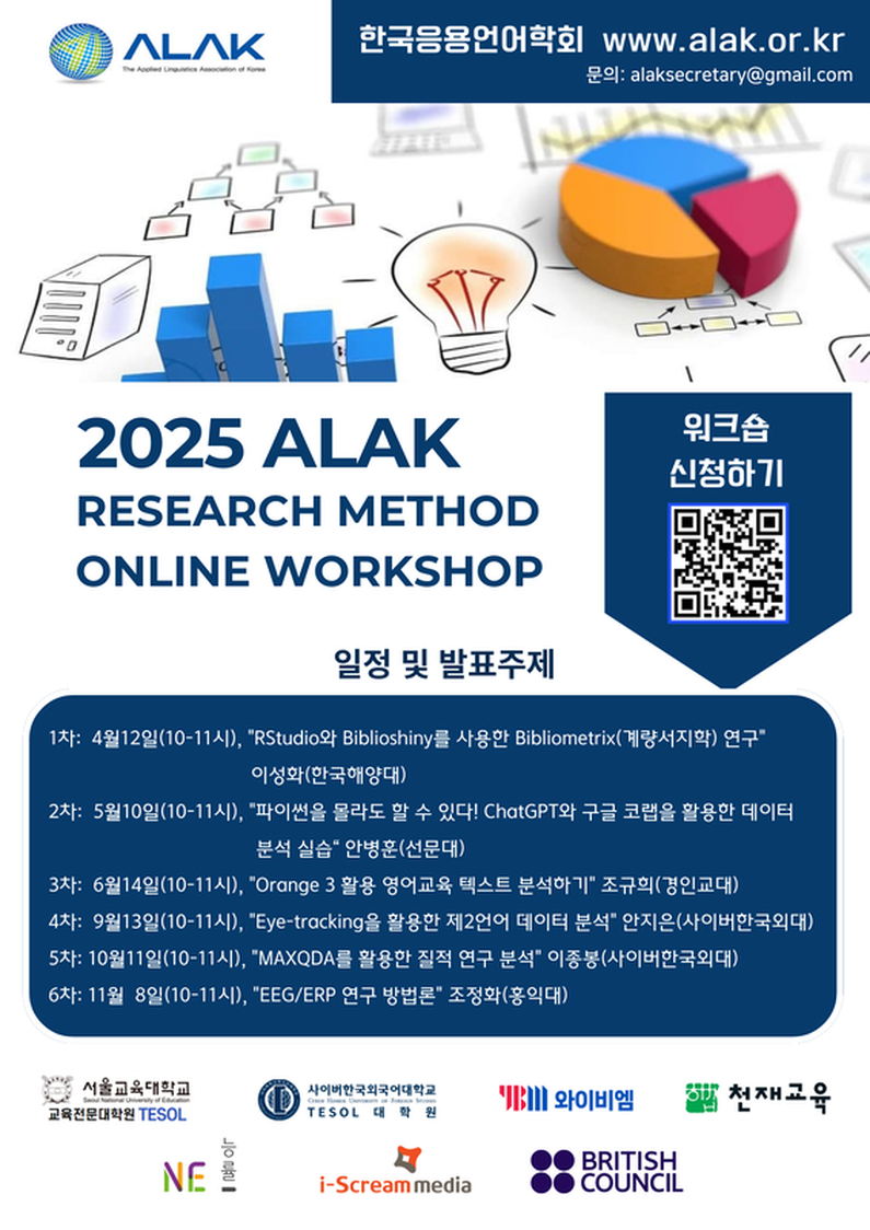 한국응용언어학회(ALAK)에서는 2025년에도 언어(교육) 연구에 실질적인 도움이 될 수 있는 연구방법론 워크숍 시리즈를 마련하였습니다.